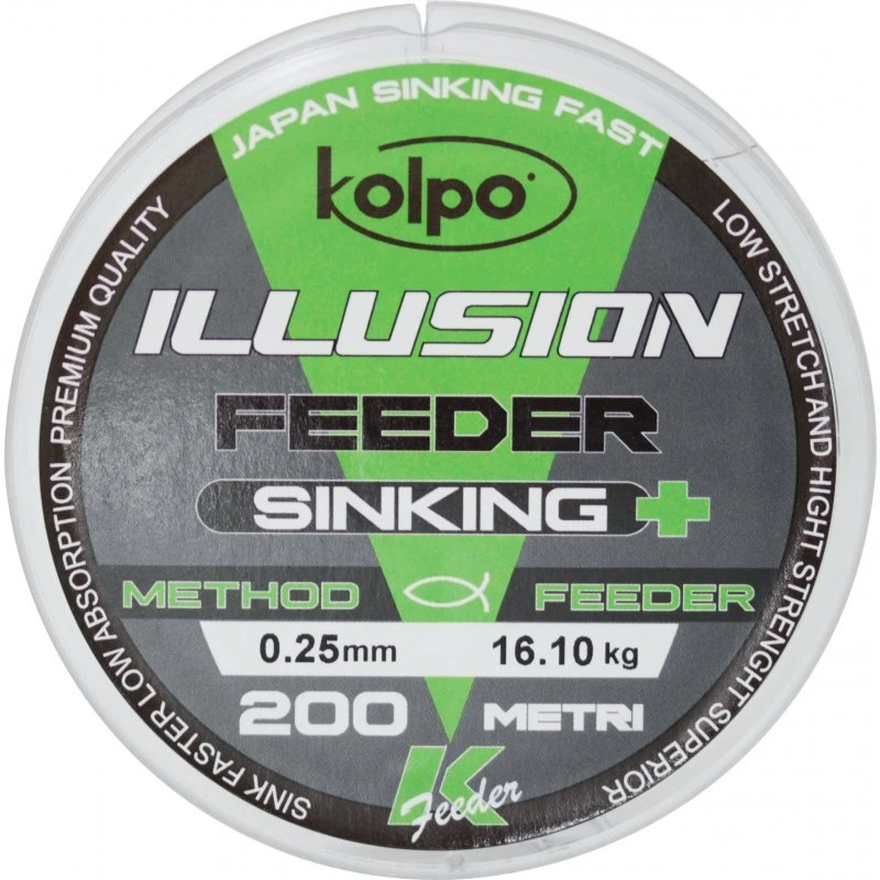 Kolpo Illusion Feeder is een snelzinkende nylon lijn die speciaal is ontwikkeld voor het method- en feedervissen. Deze lijn kenmerkt zich door de afwezigheid van geheugen, een ongelofelijke knoopvastheid, weinig tot geen rek en een hoge slijtvastheid. De lijn heeft een lengte van 200 meter en is verkrijgbaar in meerdere diameters.