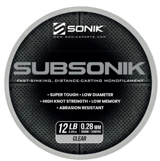 De Sonik Subsonik Clear is een transparante lijn. Subsonik is een superglad, hi-tech monofilament, dat is ontworpen voor de karpervisser die het allerbeste eist van zijn of haar materiaal. Het is geformuleerd met behulp van een complex extrusie proces dat maximale sterkte garandeert met een beperkte rekfactor. Het is ontworpen om snel te zinken, waardoor de kans op detectie wordt geminimaliseerd. De minimale rek zorgt ervoor dat bij het vissen op afstand, de indicatie op de hanger en beetmelder stukken beter is dan bij andere lijnen met meer rek. Subsonik heeft een laag geheugen en heeft een uitstekende slijtvastheid, waardoor het super sterk is en een goede keuze is voor de visser die op snaggy water vist op grote karpers. Het beschikt ook over een hoog schokabsorberend vermogen en is ultraglad, waardoor een perfecte lijnligging op big pit-molens mogelijk is, waardoor het de nummer één keuze is voor de afstandswerper!