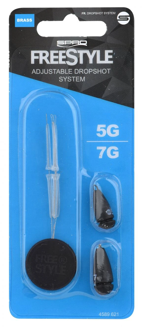 De dropshot rig, herontworpen. Dit verstelbare dropshot systeem ( DS system) stelt je in staat om direct de positie van het kunstaas te verstellen, waarbij je dus in diepte kan variëren tijdens het vissen. Het systeem bestaat uit 3 transparante stopper kits en 2 messing gewichtjes. De Freestyle Adjustable Dropshot Rig kan gemonteerd worden zonder moeilijke knopen. De haak kan vastgeklemd worden tussen de transparante stoppers of met wat meer onderlinge ruimte worden gebruikt voor meer vrije beweging van je kunstaas.